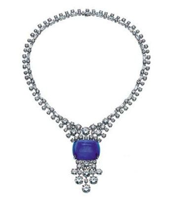 宝格丽的最新高级珠宝系列,看似简单的设计用最简洁的线条衬托出珠宝的美,钻石的排列犹如一条从颈间倾斜而下的瀑布。项链最底端镶嵌了一颗95克拉塔糖形蓝宝石,整条项链供镶嵌了61.98克拉的钻石。