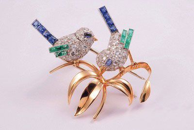 卡地亚擅长设计生动灵巧的动物造型,这只1942年的 18K黄金小鸟胸针,运用钻石、蓝宝石与祖母绿营造清新活泼气氛/1,420,000元。