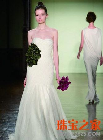 白色的婚纱和腰间深绿色花朵的设计形成鲜明对比,裙身的斜纹褶皱和鱼尾裙摆带着一股轻盈,使新娘洋溢着幸福的感觉。(vare wang)