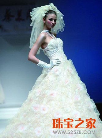 高腰线的设计和蓬蓬裙摆上密集的花朵,营造出花神般的美丽,头纱上的花朵和婚纱相互映衬,十分和谐。