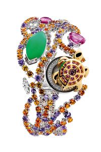 运用璀璨多彩的宝石与碎钻,串结成隐匿式的镯表款,如饰品般缤纷闪耀,让你整体造型更显华丽迷人。