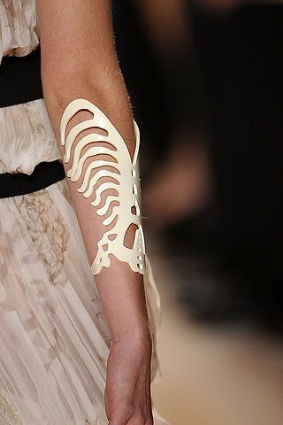 本季的Christian Lacroix带来了华丽的如高级定制般的成衣系列。它的华丽感不仅仅来源于繁多的珠宝装饰,更有如鲸鱼骨造型的项链及手镯。保留骨骼的原始造型的新型手镯因为大胆被运用到手镯设计上而备受关注。