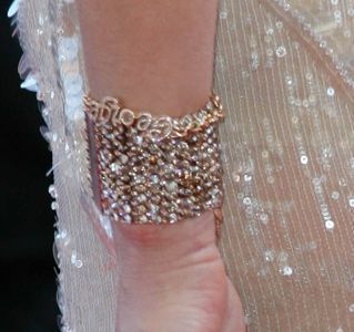 超模 Eva Herzigova 选择裸色镶满亮色的 Versace 长裙出现在戛纳电影《寻找埃里克》(Looking For Eric)首映礼上,9天以前 Donatella Versace 也曾选择这条长裙出席白宫省盛会。 Eva Herzigova 的大耳环十分抢镜。