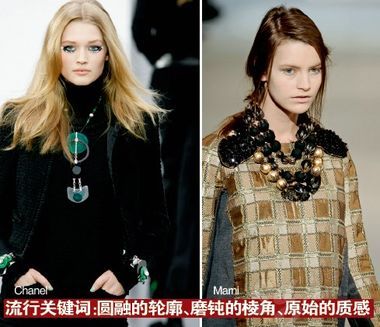立体主义已经流行了两年,同样大量运用原始石材并强调其本身的质感和建筑般的轮廓,然而今年秋冬,最常见的圆形更强调圆融混沌的轮廓,而方形则消弱了从前的尖锐气场,磨圆了自己的棱角,这样一来材质本身的原始力量得到了更大程度的高扬,夸张石料的项链和手镯进一步强调存在感,而厚重的金属也成为体现原始力量的生力军,一种更为质朴,甚至带着些许混拙的立体主义诞生了。