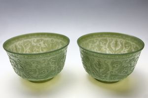 青玉油润细腻,色泽均一。周身浮雕缠枝花纹,线条婉转雅致。此对碗具有典型的痕都斯坦风格,雕琢精美细腻,成对出现,实属难得。
