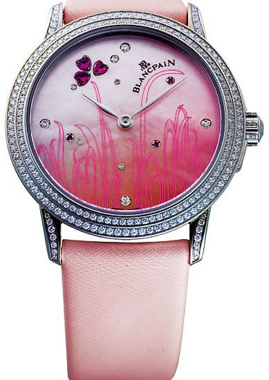 Blancpain于1956年推出的世界上最小的女装圆形手上弦机械机芯腕表——Ladybird系列腕表,今年表盘图案取材自大自然的花草,搭配珍珠贝母与钻石,让整枚表闪闪生辉。