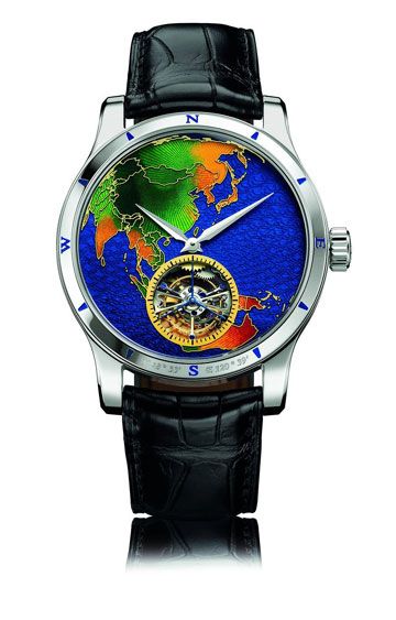 积家(Jaeger-LeCoultre)陀飞轮珐琅彩绘铂金腕表这款铂金腕表的表盘采用内填珐琅,并以不同地理区域为主题,精心雕刻三款不同表款:亚洲和澳大利亚、美洲和欧洲,以及非洲和中东,其中陆地和海洋分别饰以日辉纹和波浪纹。每款限量生产20枚。表壳:铂金材质,圆形表壳,表圈采用雕花刻度和基本方位,蓝宝石水晶底盖,可显示机芯运转。表盘:以地理区域为主题的内填珐琅彩绘微缩画,阿尔法形指针机芯:自动上弦机芯,配备陀飞轮,302枚零件,33枚宝石轴承,48小时动力储备,每小时振频28,800次。功能:时、分、小秒针显示。